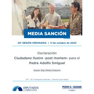 “Que los jóvenes hayan elegido un ejemplo a seguir, basado en sueños y el trabajo arduo para lograrlos, ratifica que la verdadera trascendencia está basada en lo que se hace y no en lo que se dice… Que hayan elegido al Padre Adolfo Smiguel, a quien conocen por sus obras educativas y comunitarias, como un modelo a seguir, es un gran orgullo para todos…”, dijo el presidente de la Cámara de Diputados Pedro Cassani tras otorgarse por unanimidad, media sanción al proyecto de ley que declara Ciudadano Ilustre -post mortem- al Padre Adolfo Smiguel.